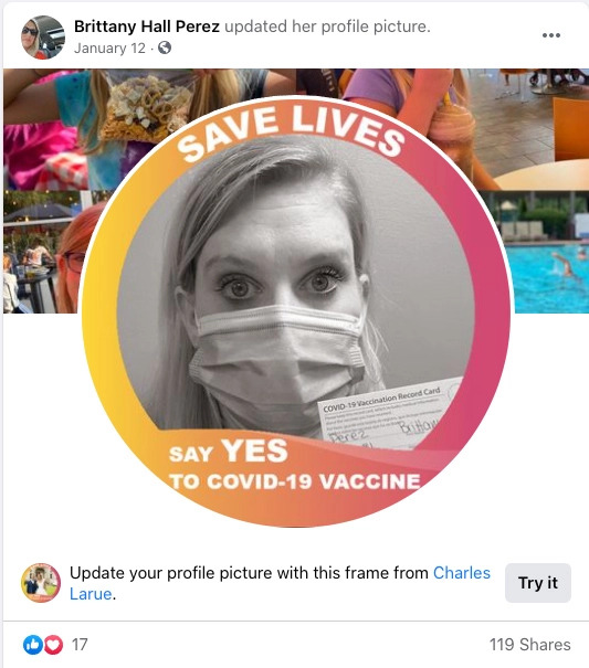 A template surrounding the photo states, “Save lives. Say yes to Covid-19 vaccine.”