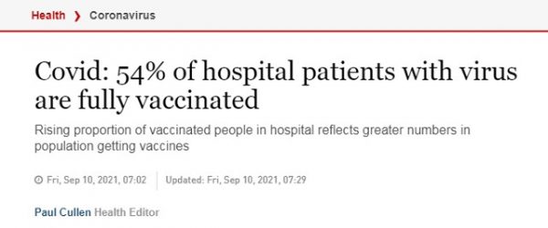 Ireland, where nearly 90% of the adult population is vaxxed, reported Friday that 54% of patients in their hospitals with covid were fully vaccinated (which is an underestimate as they define “fully vaccinated” as being two weeks out from your last double jab or one week out from your second jab for Pfizer).