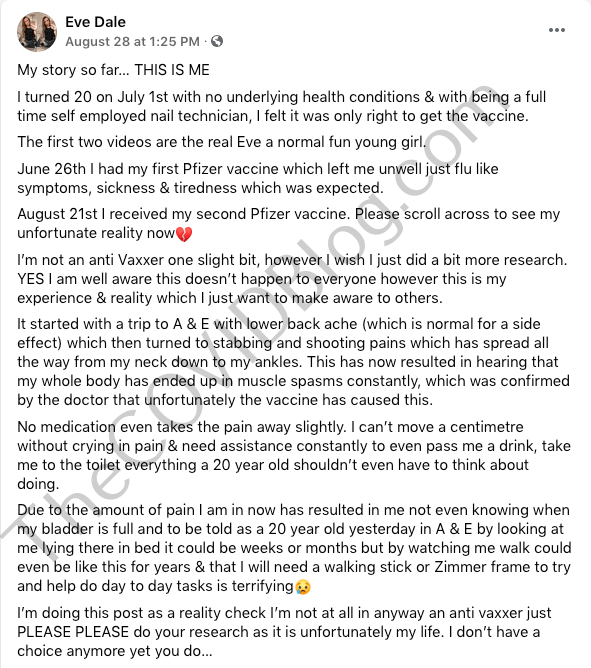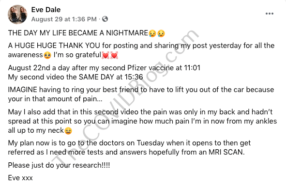 Ms. Eve Dale received her first Pfizer mRNA injection on June 26, according to her Facebook page. She reported general malaise and fatigue, but said she expected that to happen. The second mRNA injection came on August 21.