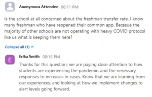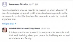 One member of the ad hoc infectious disease task force, Ariella Rabin Rotramel, currently serves as the College’s “Interim Dean of Institutional Equity and Inclusion,” and is also Associate Professor of Gender, Sexuality and Intersectionality Studies, with a specialty in “Queer Theory and Activism.” Here is Rotramel answering a Zoom question from an anonymous student: